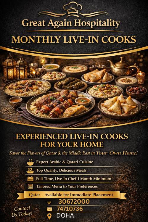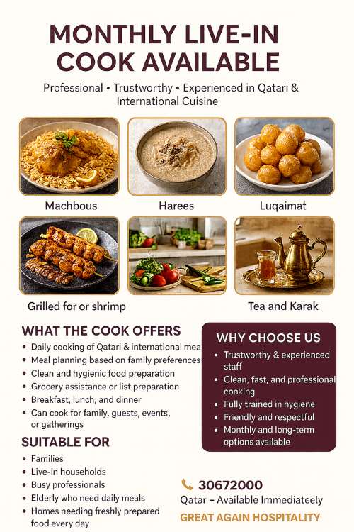 Maid available live in cooks.