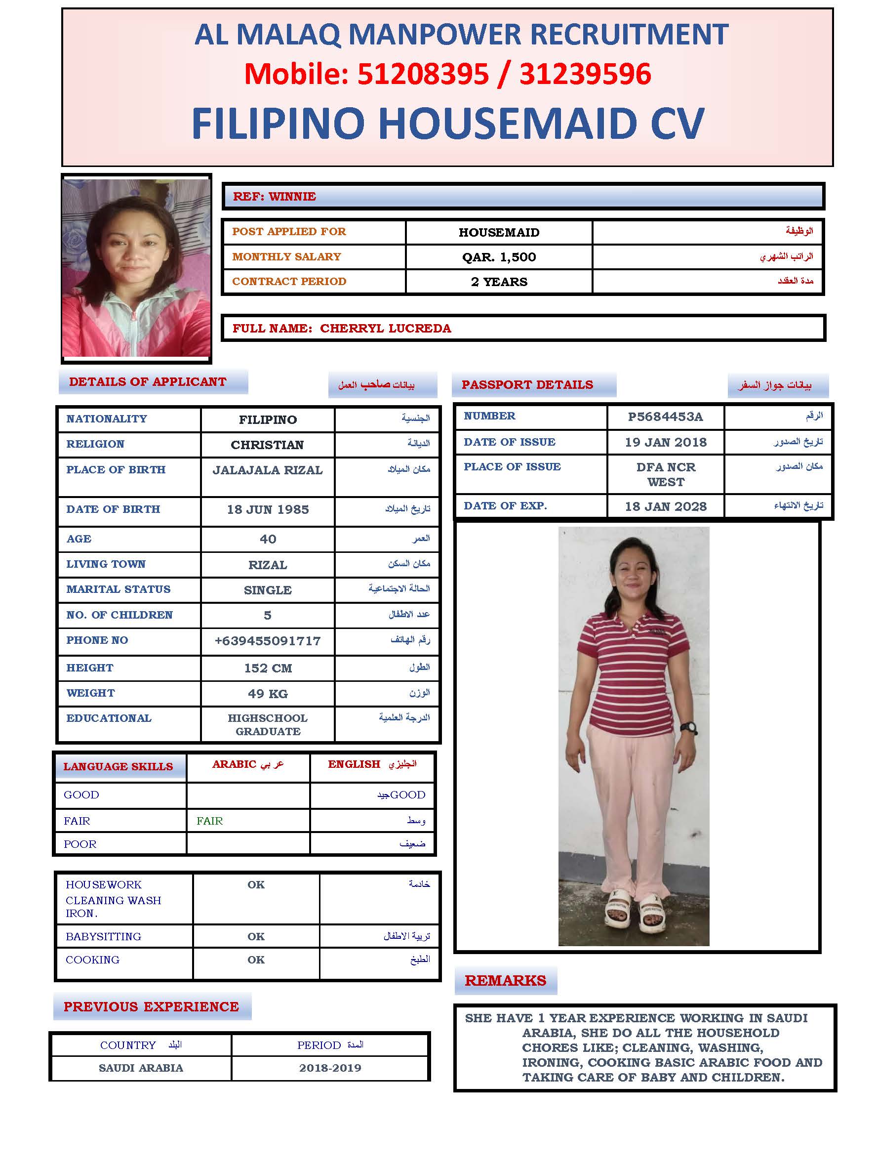 Maid CHERRYL LUCREDA