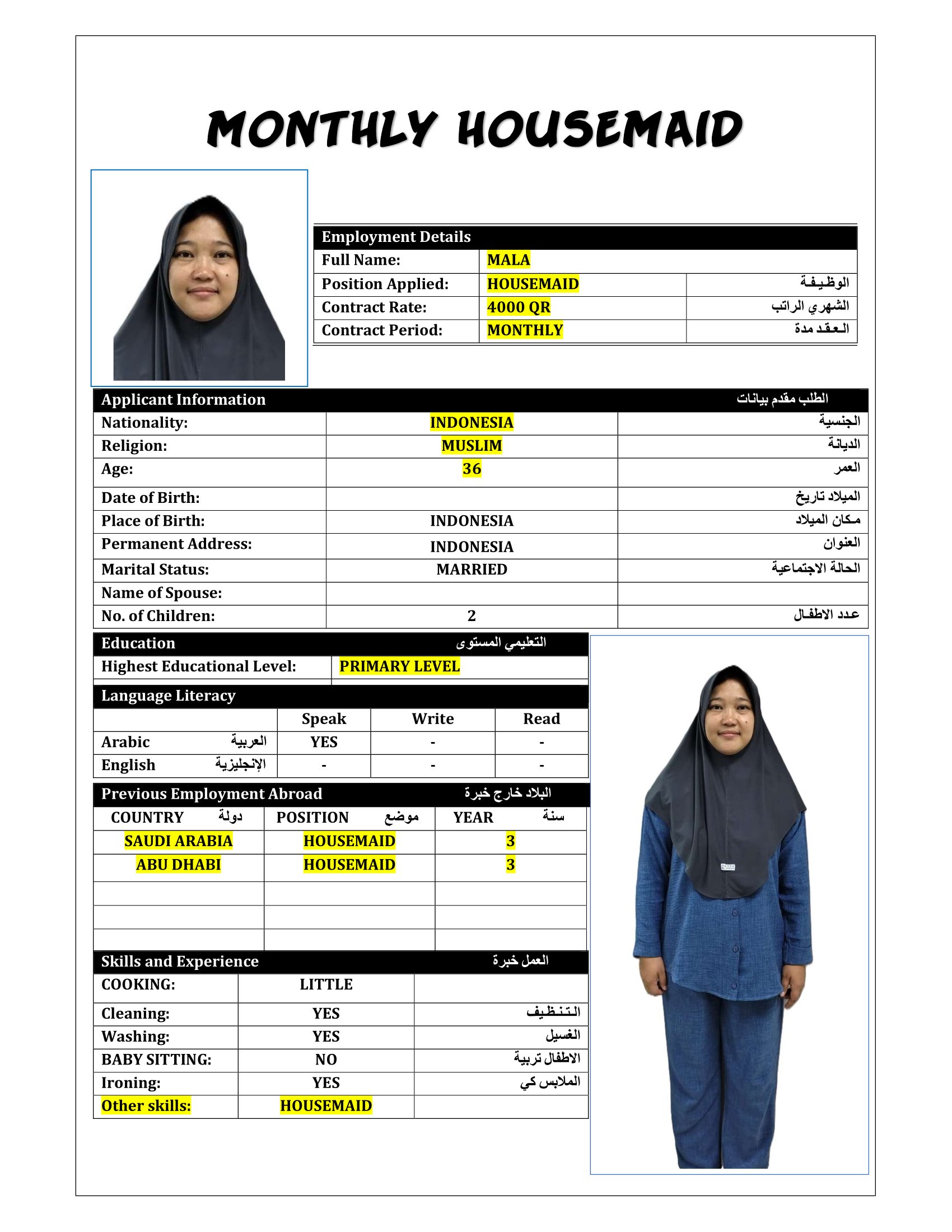 Maid MALA MONTHLY HOUOSEMAID